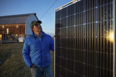 Dan Litchfield of Invenergy showing off a solar panel (Emily Hamer | Wisconsin Center for Investigative Journalism via AP)