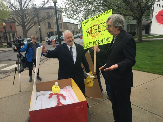¶ “As Nuclear Costs Soar, Sides Split Over Energy Source’s Future” • Activists in Monroe, Michigan held a “funeral” for nuclear energy, represented by an old power industry mascot, Reddy Kilowatt. They were celebrating the nuclear industry’s financial struggles, which forced several reactors to close while others seek bailouts. [Detroit Free Press]