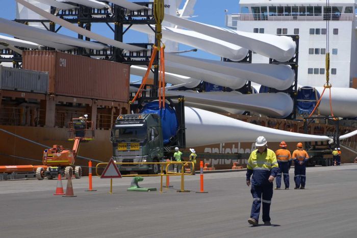¶ “From China To The Outback: Logistical Nightmare Behind Transport Of Gigantic Wind Turbines” • Workers are preparing to transport a new wind farm more than 630 km inland to power one of Australia’s biggest gold mines. Fifteen 66-meter blades came in from China by ship. They are to be moved to the Agnew gold mine in the northern Goldfields. [ABC News]