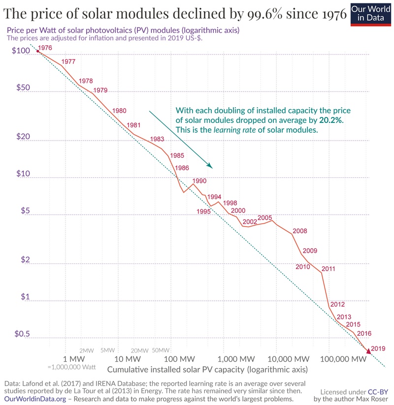 ¶ “Solar Is Now The Cheapest Energy In History” • Thanks to incrementally better technology, panel design, and scale of manufacture, solar panels have become incredibly cheap. In the past decade alone, their price per unit of generated energy has fallen by 85%, so much so that multiple reports consider solar to be the cheapest energy ever. [ZME Science]