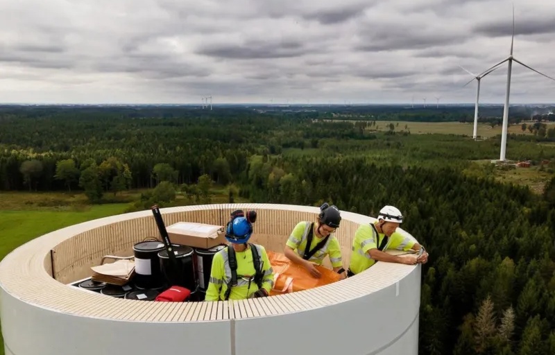 ¶ “World’s Tallest Wooden Wind Turbine Starts Turning” • A Swedish start-up called Modvion says it has just built the world’s tallest wooden turbine tower. The 2-MW generator on top has just started supplying electricity to the Swedish grid, providing power for about 400 homes. Modvion claims that using wood for wind power is the future. [BBC]