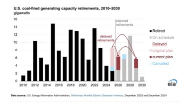 ¶ “US Coal-Fired Generating Capacity Retired In 2025 Was the Least In Fifteen Years” • During 2025, 2.6 GW of coal-fired capacity were retired, the least since 2010. Coal plant operators had planned to retire 8.5 GW of capacity, but 4.8 GW of planned retirements were delayed, and the operators cancelled plans for 1.1 GW to retire. [CleanTechnica]